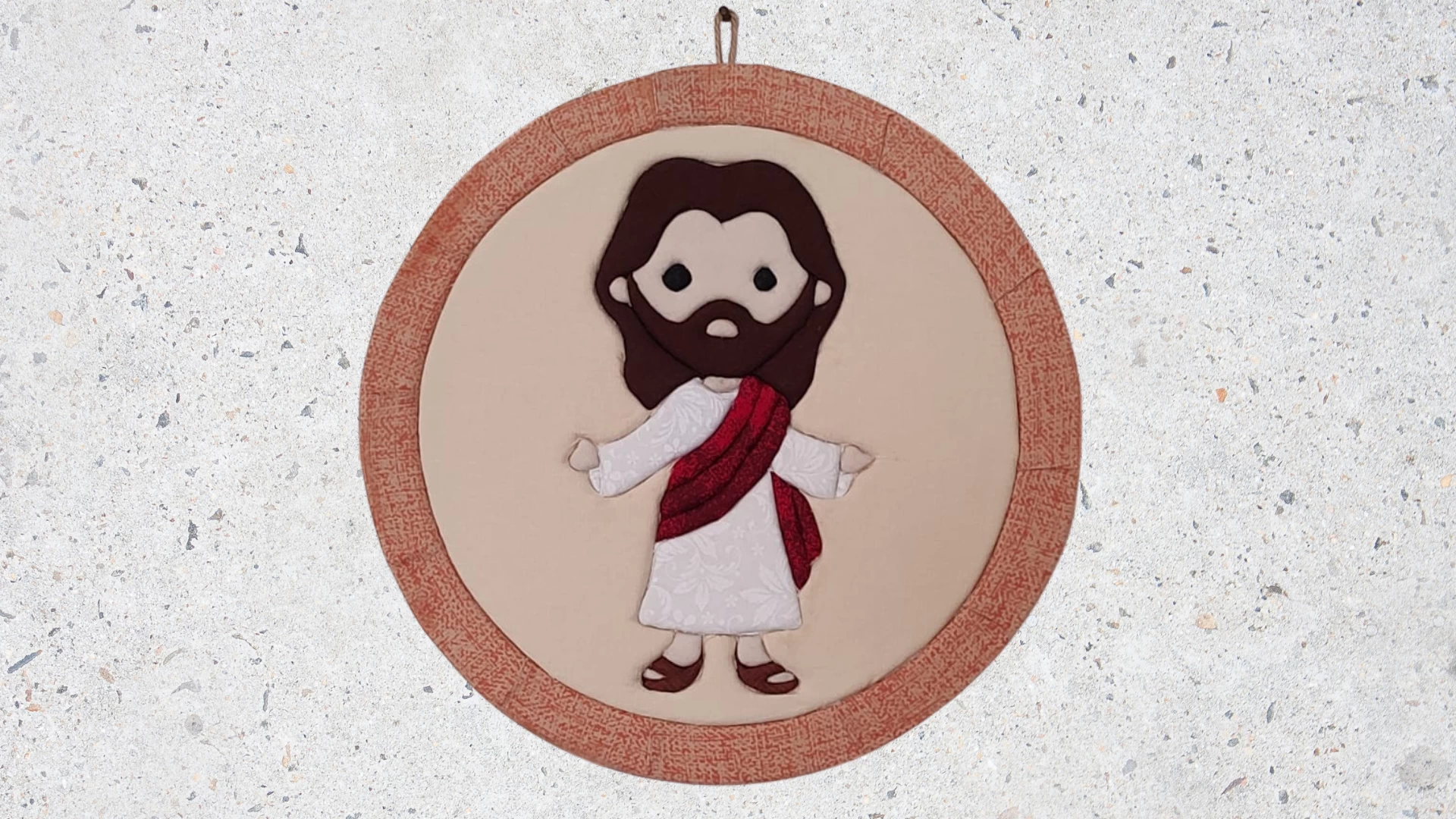Imagem de Jesus artesanal em patchwork embutido, peça religiosa decorativa feita à mão. Presente especial para quem valoriza fé e artesanato em Ilhabela.