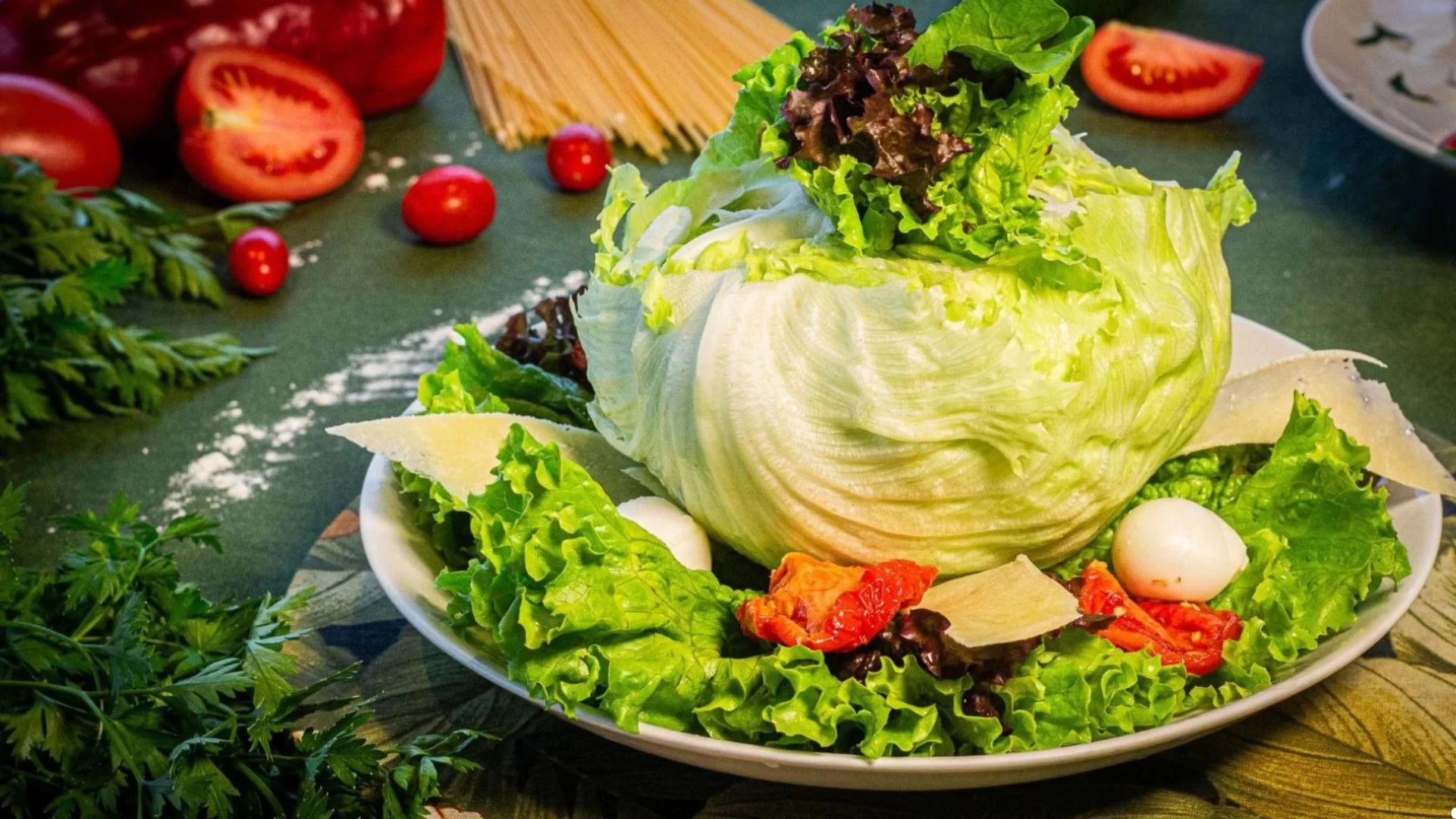 Salada Pimenta de Cheiro: Mix de folhas verdes, mussarela de búfala, lâminas de queijo parmesão, rúcula e tomate seco