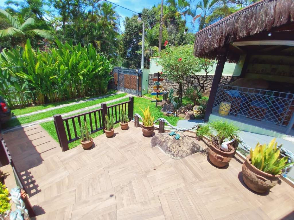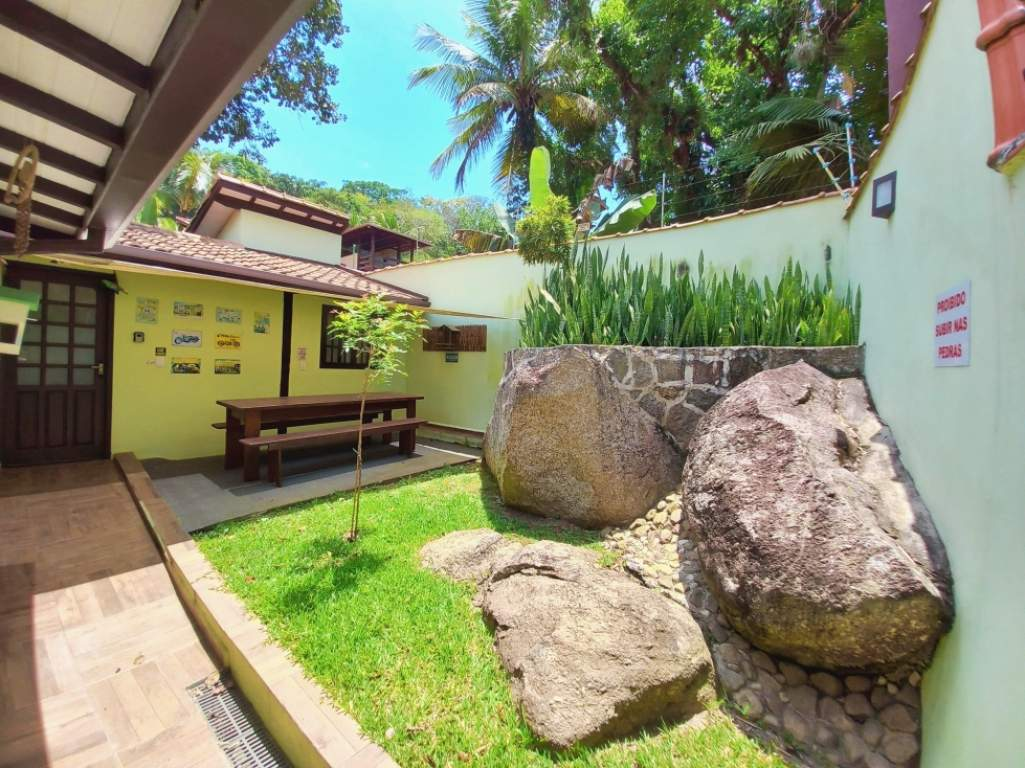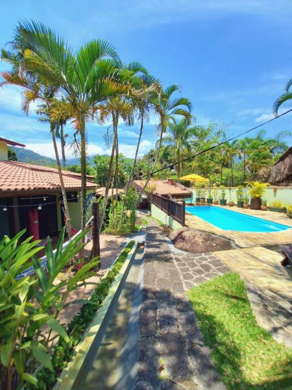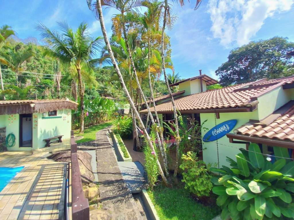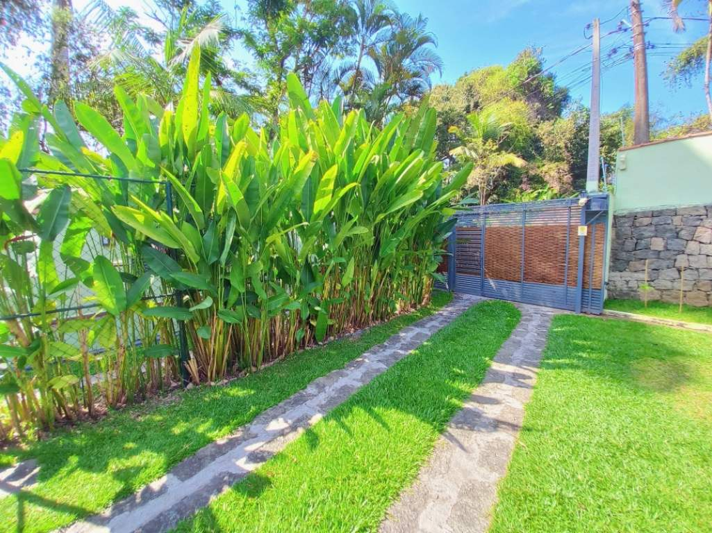 Amplos jardins com caminhos de pedras, árvores frutíferas e paisagismo tropical.