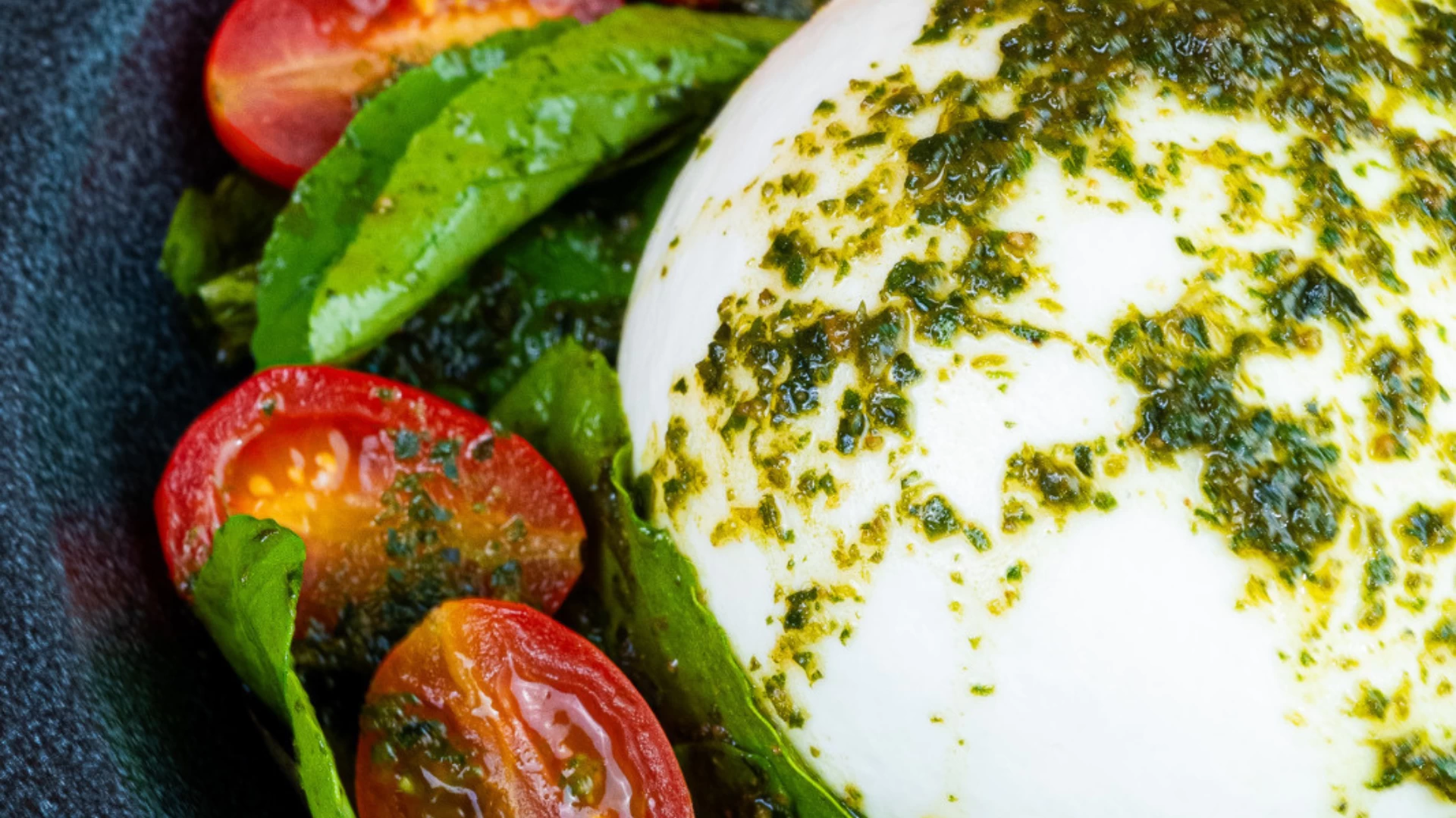 Burrata servida com Rúcula fresca cobertas por Molho Pesto.