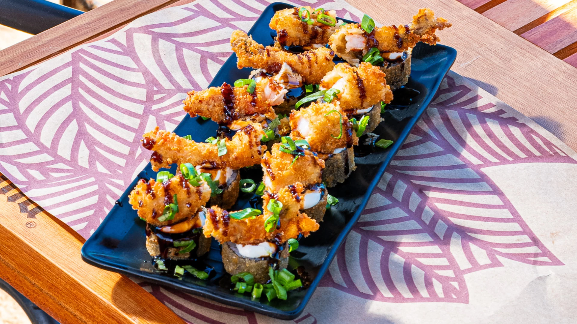 Hot Roll Salmão, Camarão, Cream Cheese, cebolinha e Gergelim, coberto com molho de tarê