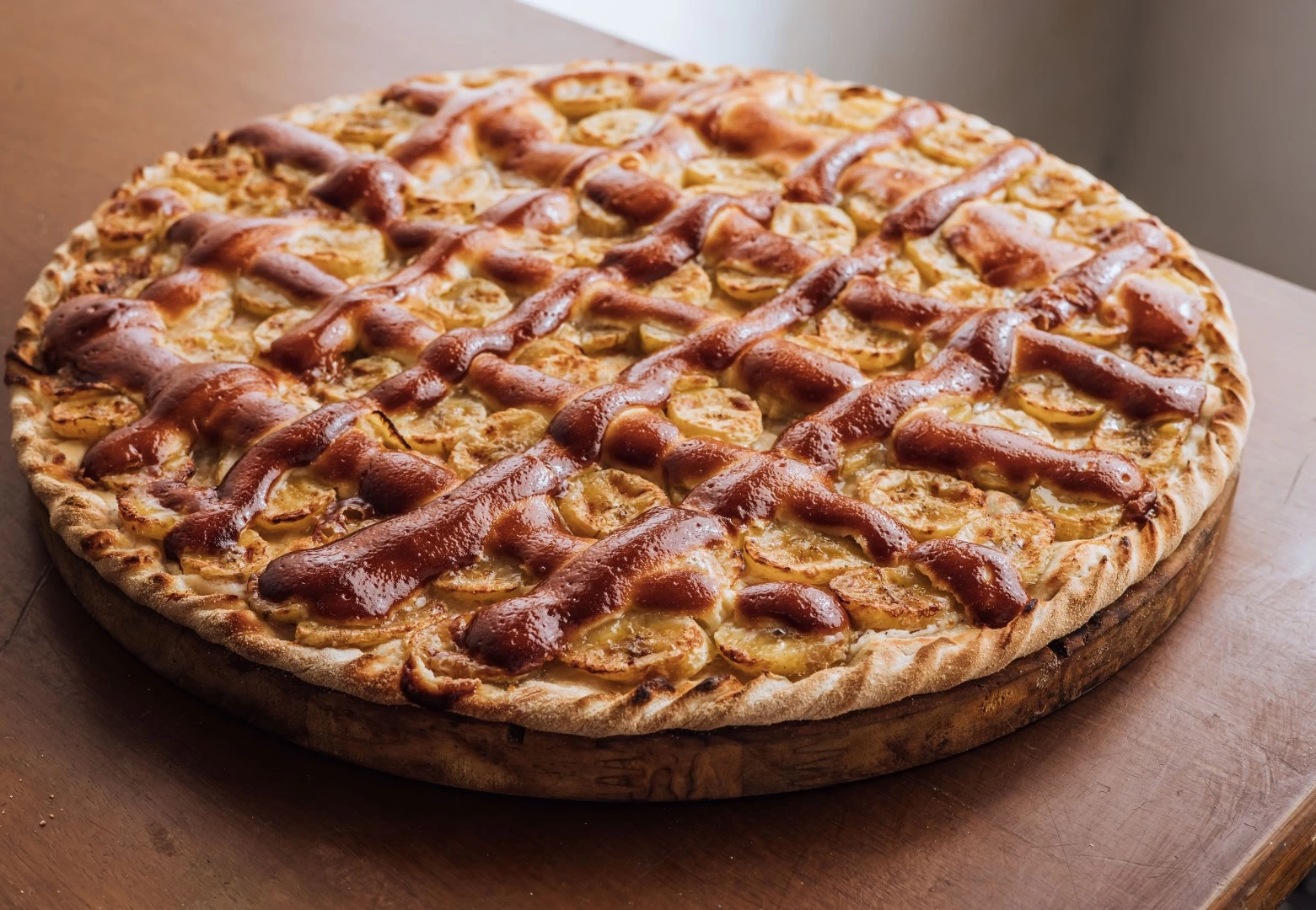 Massa fina artesanal, creme de leite, banana em rodelas e chocolate branco.