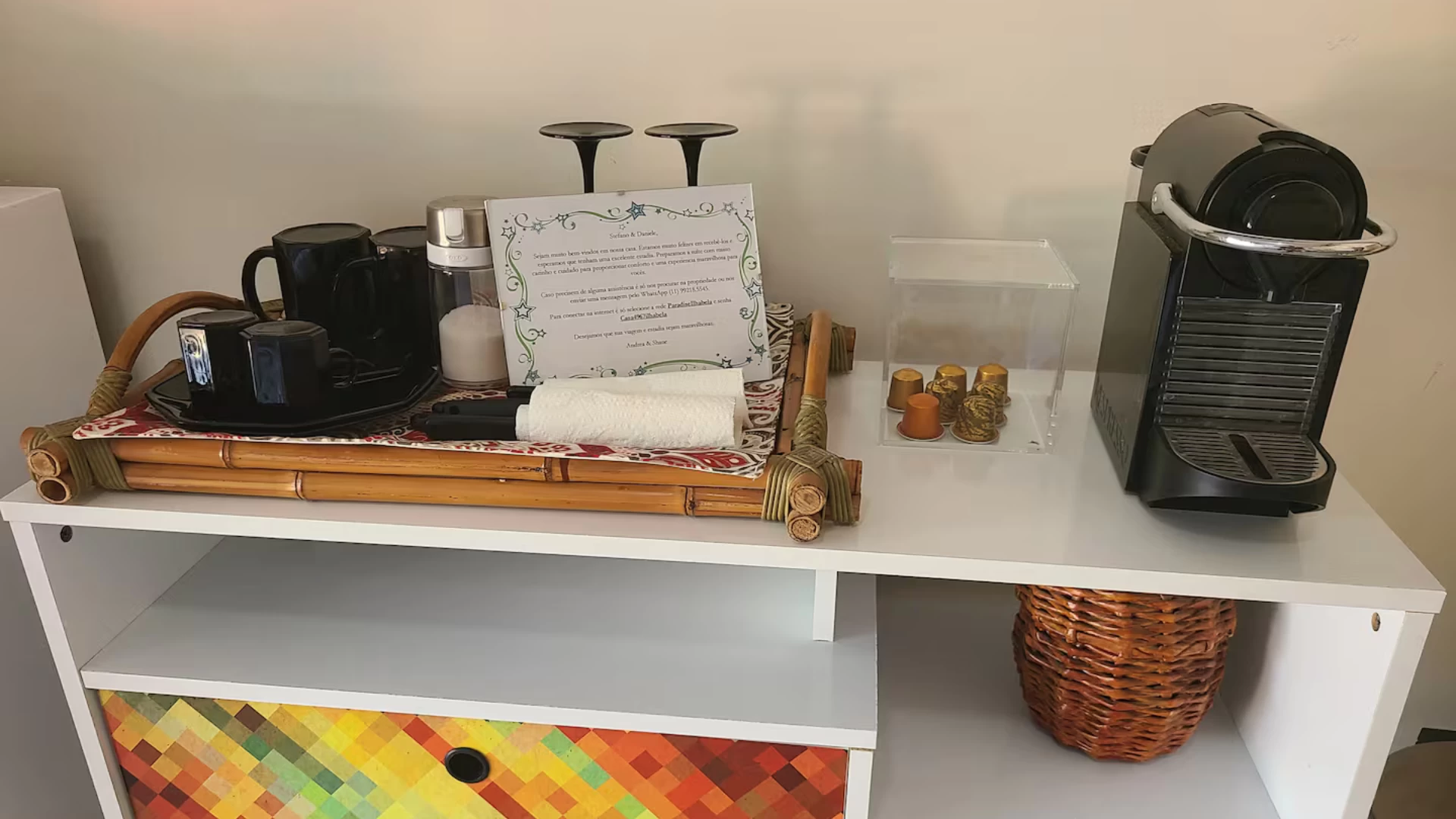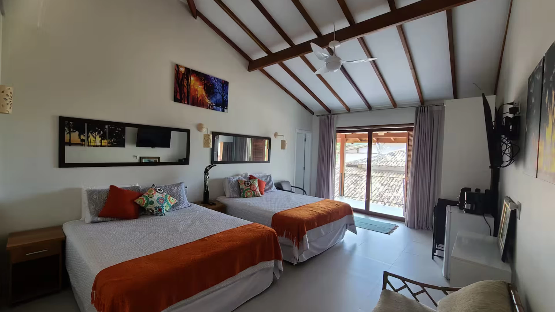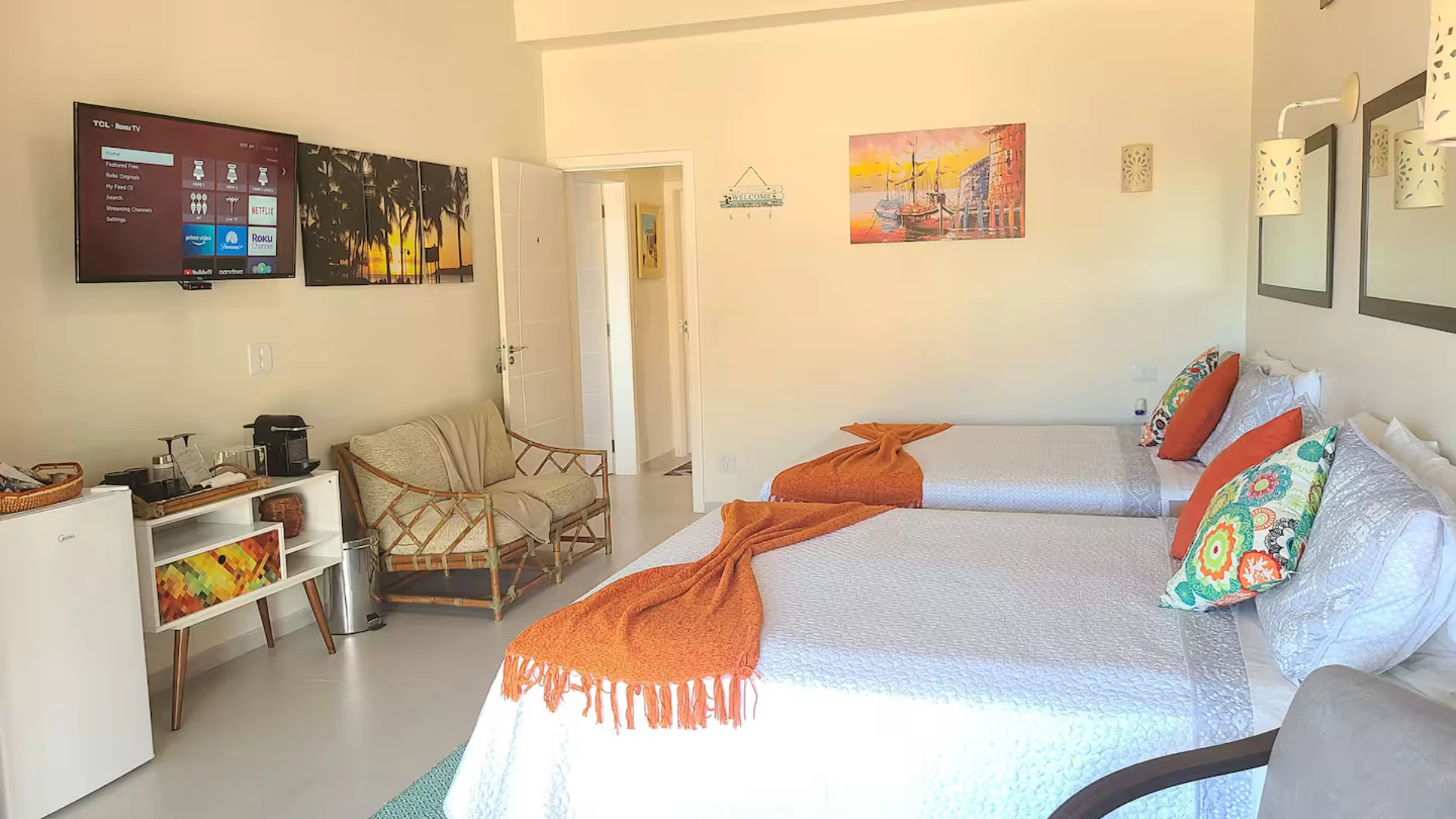 A suite e super espaçosa, com pé direito alto, duas lindas e confortáveis camas Queen size, rede na varanda, blackout na porta, frigobar, máquina nespresso, ar-condicionado frio e quente, ventilador de teto, Smart TV/Roku, guarda-roupas e secador de cabelo.