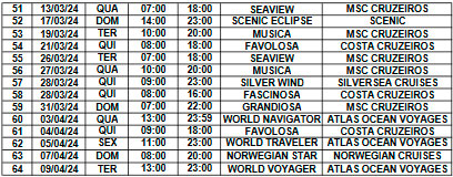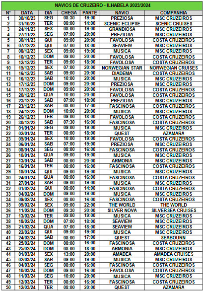 A lista completa com a escala dos navios de cruzeiro em Ilhabela para a temporada 2023/2024 está abaixo.