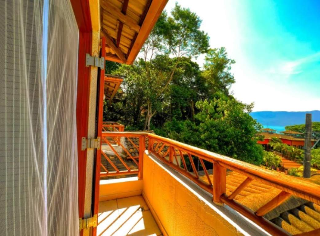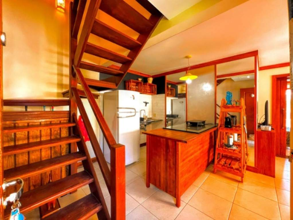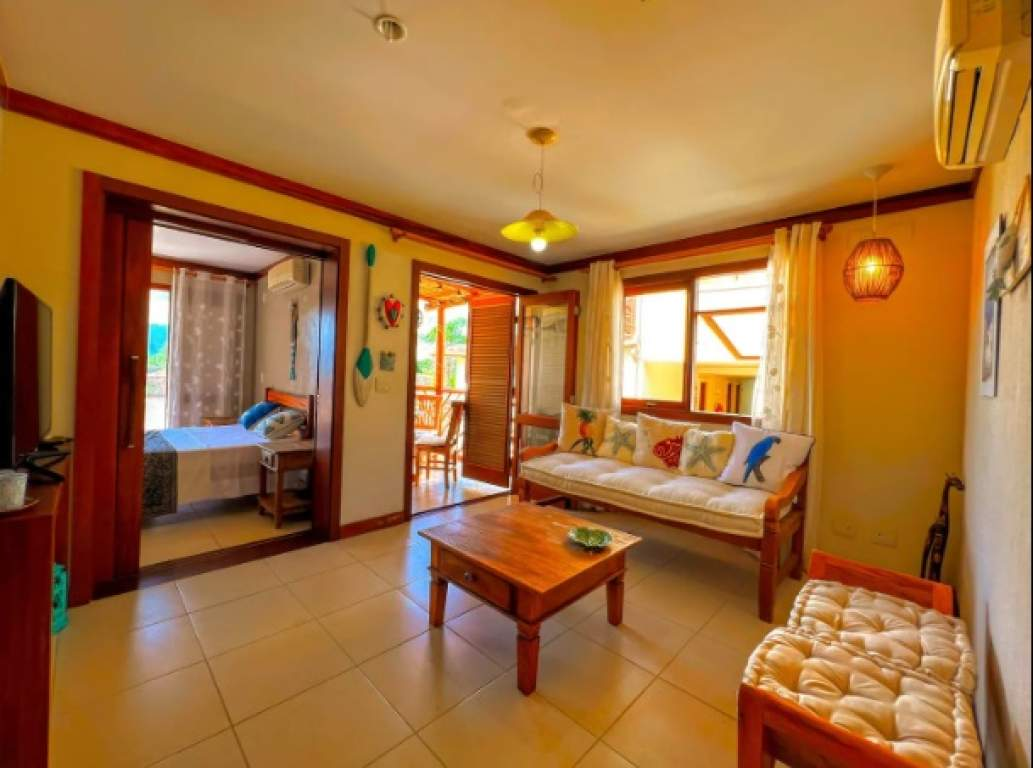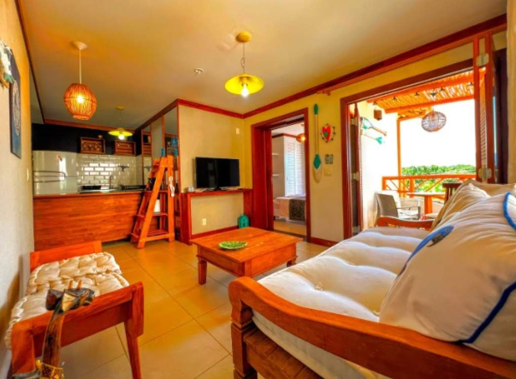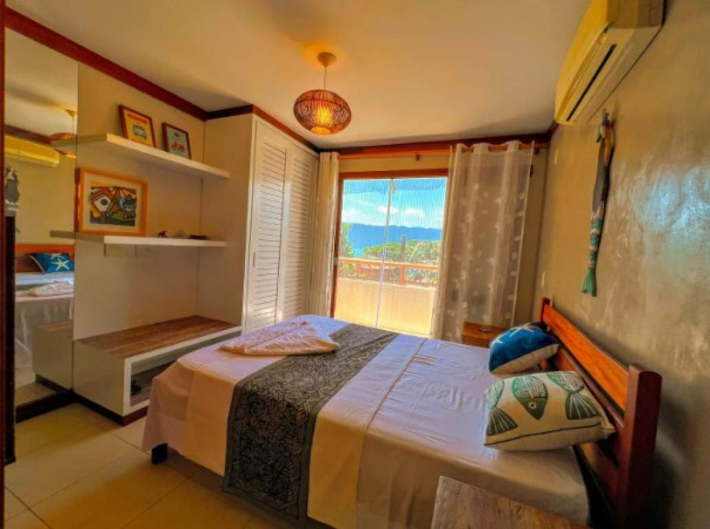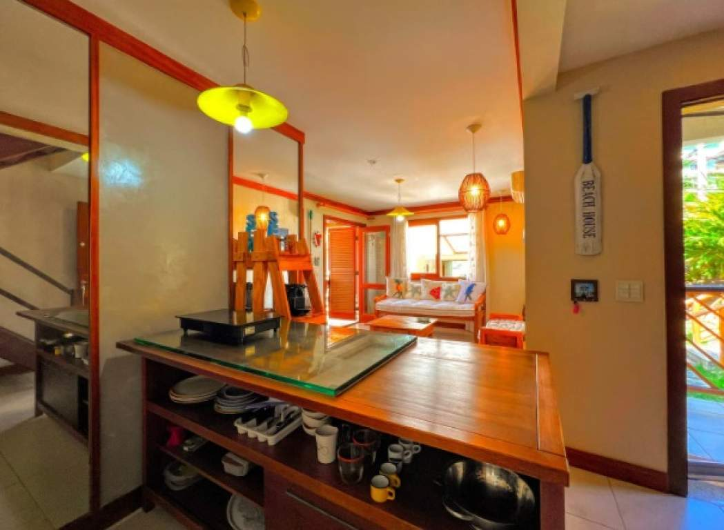 O bangalô é duplex, possui 2 suítes, a suíte master no andar superior, têm closet, banheiro com dois chuveiros e varanda. No andar inferior, possui uma suíte, varanda com mesa externa, sala e cozinha bem equipada. Todos os cômodos possuem vista para o mar.