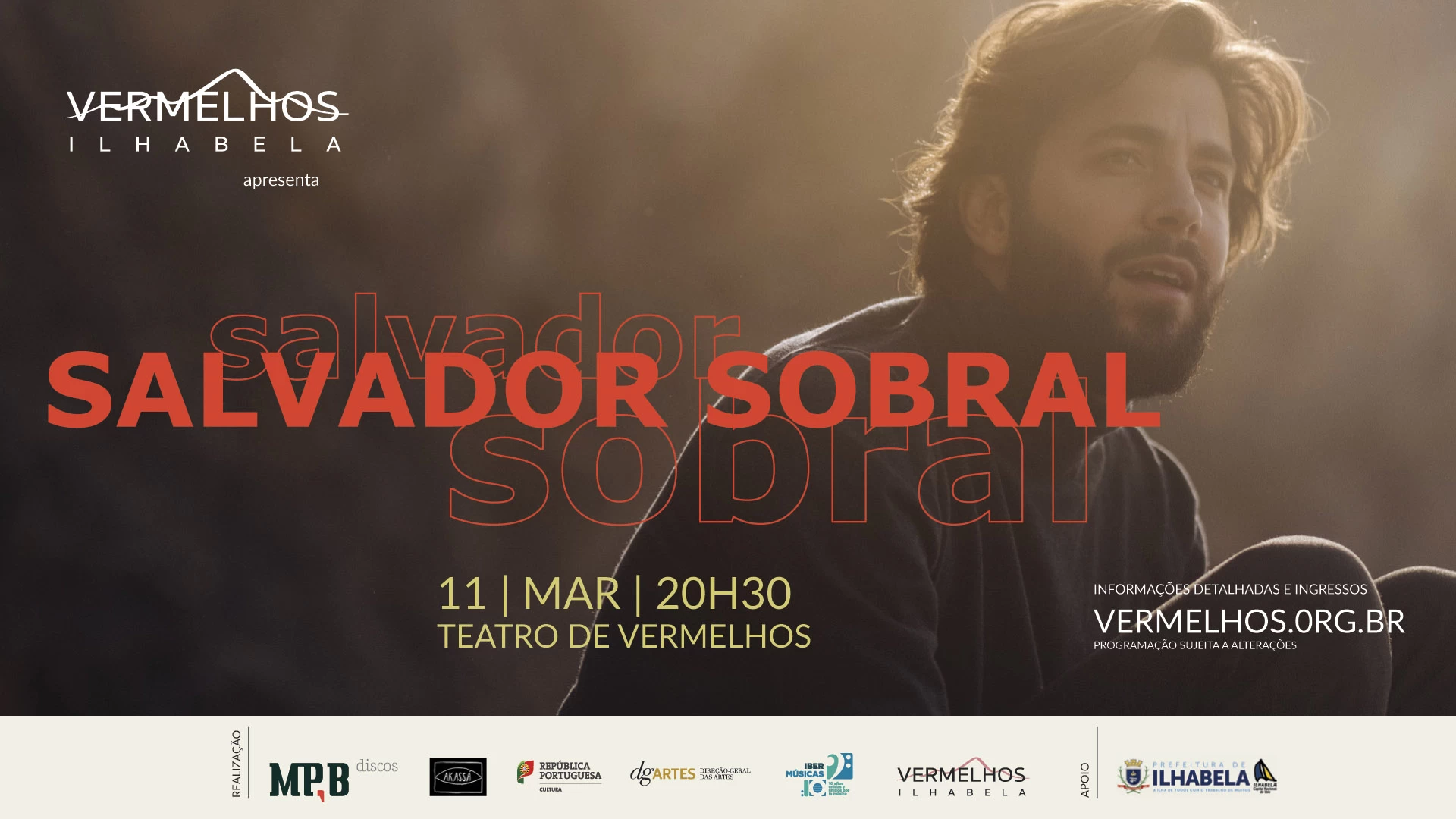 Vermelhos e o público de Ilhabela são agraciados com a presença de um dos mais importantes nomes da geração atual de músicos da Europa. Vencedor do Festival da Eurovisão e nomeado para o Grammy, o português Salvador Sobral se apresenta no Teatro de Vermelhos na turnê de lançamento do seu novo disco, acompanhado pelo guitarrista André Santos e pelo pianista Max Agnas em sua primeira passagem pelo Brasil.