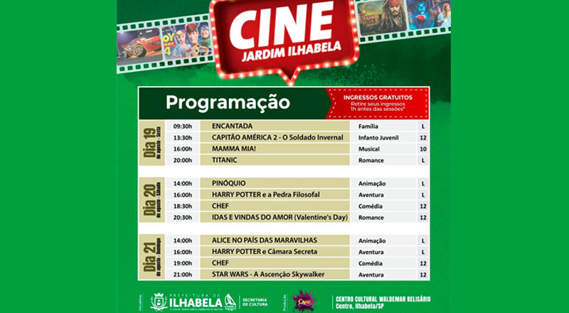 O “Cine Jardim Ilhabela” conta com filmes nos gêneros drama, infantil, ação, comédia, suspense e infanto-juvenil, com clássicos do cinema internacional e nacional, além de acessibilidade e classificação livre, 12 e 14 anos. Todos os filmes têm entrada gratuita com distribuição de ingressos uma hora antes do início de cada sessão e limitados a 60 lugares.