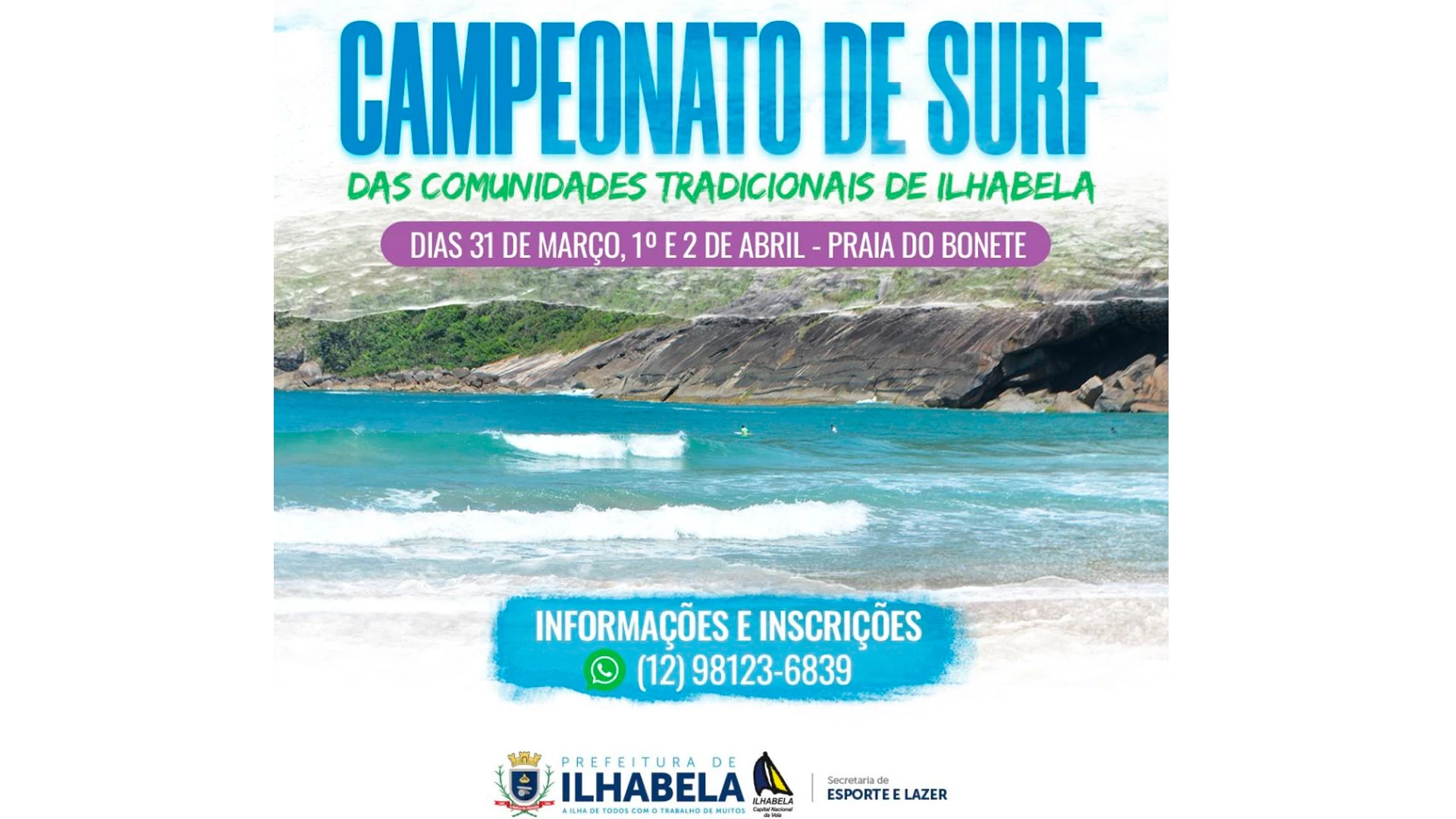 É hora de pegar onda! A Praia do Bonete recebe o Campeonato de Surf das Comunidades Tradicionais de Ilhabela nos dias 31 de março, 1º e 2 de abril. A participação no evento é para todos os atletas que tiverem interesse e que se encaixem nas categorias apresentadas.