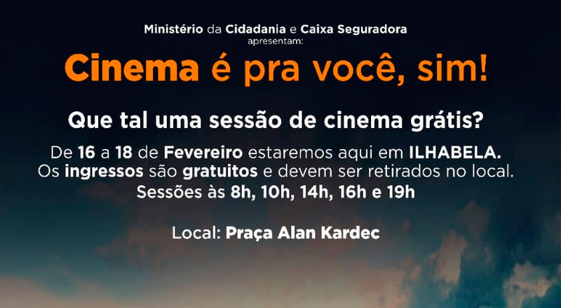 O final de semana em Ilhabela, entre os dias 16 e 18, será animado. A cidade receberá o projeto social e cultural “Cinema é pra você, sim – Caixa Seguradora”, na praça Alan Kardec, na Barra Velha, com abertura oficial às 10h de sábado (16).
