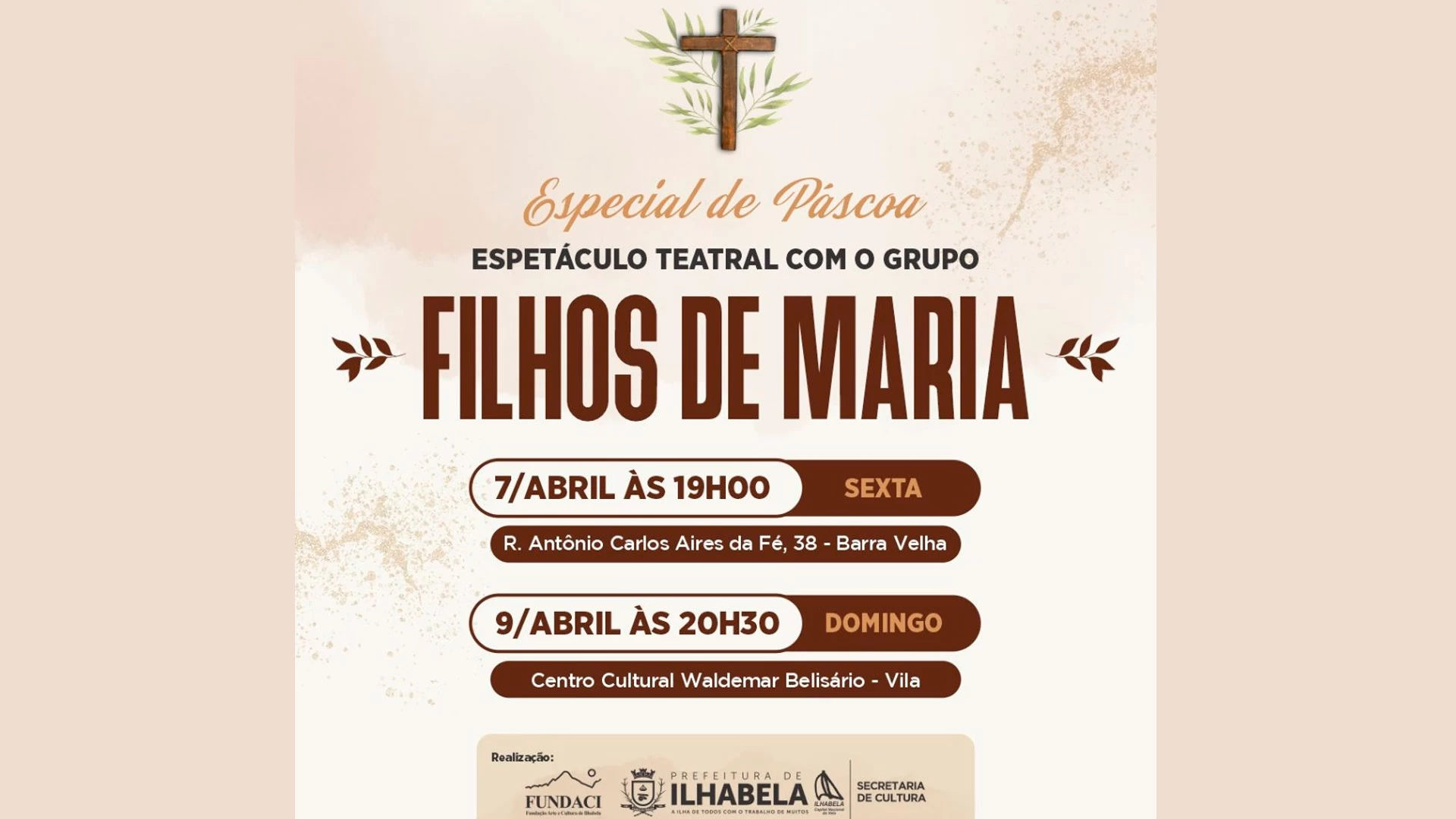 A Prefeitura de Ilhabela, por meio da Secretaria de Cultura e da Fundação Arte e Cultura (Fundaci), apresenta o espetáculo teatral “Especial de Páscoa”, encenado pelo grupo teatral “Filhos de Maria”, composto por alunos da Fundaci nesta sexta-feira (7) às 19h na Paróquia Nossa Senhora Aparecida – Barra Velha e no domingo (9) às 20h30 no Centro Cultural Waldemar Belisário – Vila.