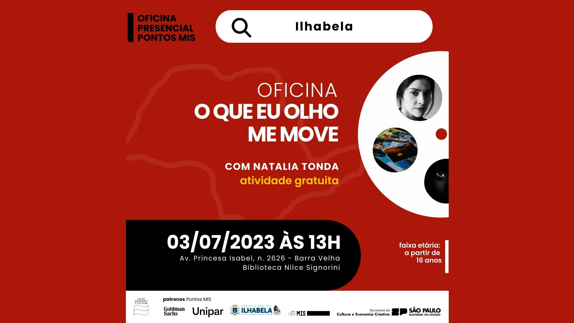 Realizada pelo Pontos Mis de Ilhabela, a oficina presencial “O que eu olho me move” revela a fotografia não apenas como um documento de memória, mas também como um meio de contar uma história, além de mostrar como a fotografia documental se configura na contemporaneidade. A oficina visa abordar alguns nomes da fotografia documental e suas formas de narrar histórias diversas, com o intuito de estimular o participante a observar e encontrar uma linha narrativa em seu próprio cotidiano. Será proposta uma atividade de documentação a partir de um texto, onde em duplas os participantes deverão simular uma história e registrar o processo.
