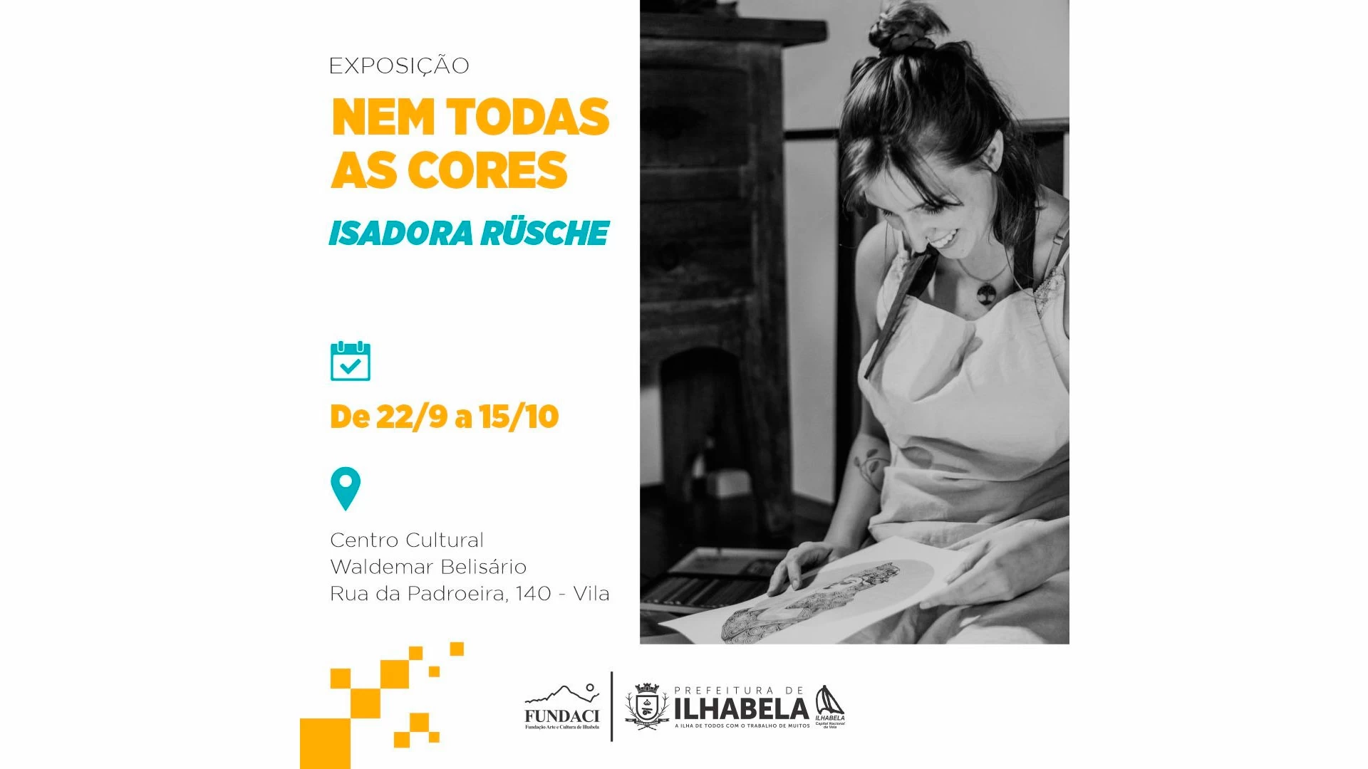 O Centro Cultural Waldemar Belisário recebe entre os dias 22 de setembro e 15 de outubro a exposição “Nem todas as cores” da artista Isadora Rüsche. A coletânea de trabalhos exibidos é um convite ao encontro entre o natural interno e externo, um passeio pela intersecção entre o selvagem interior e o exterior.