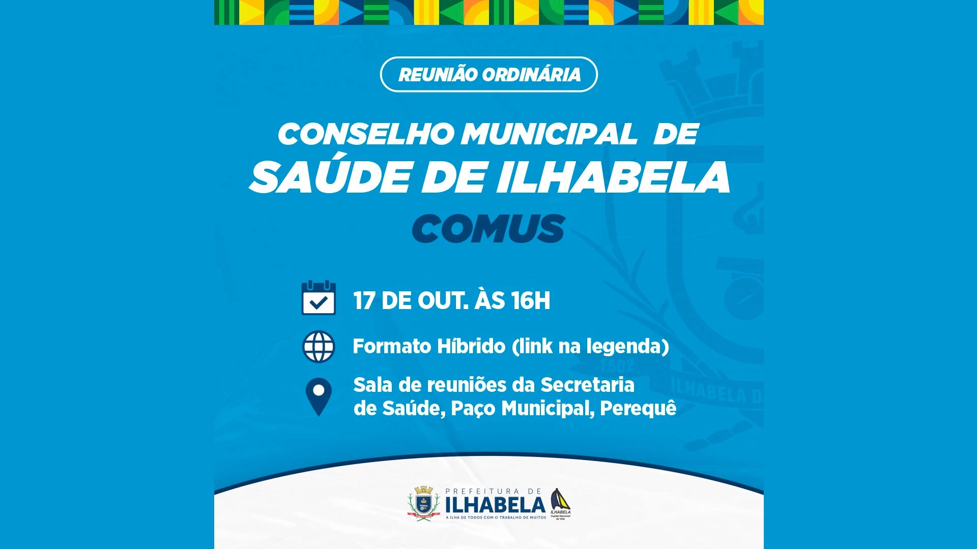 O Conselho Municipal de Saúde de Ilhabela (COMUS) convoca seus conselheiros para a realização de uma reunião ordinária agendada para a terça-feira, dia 17 de outubro, às 16h.