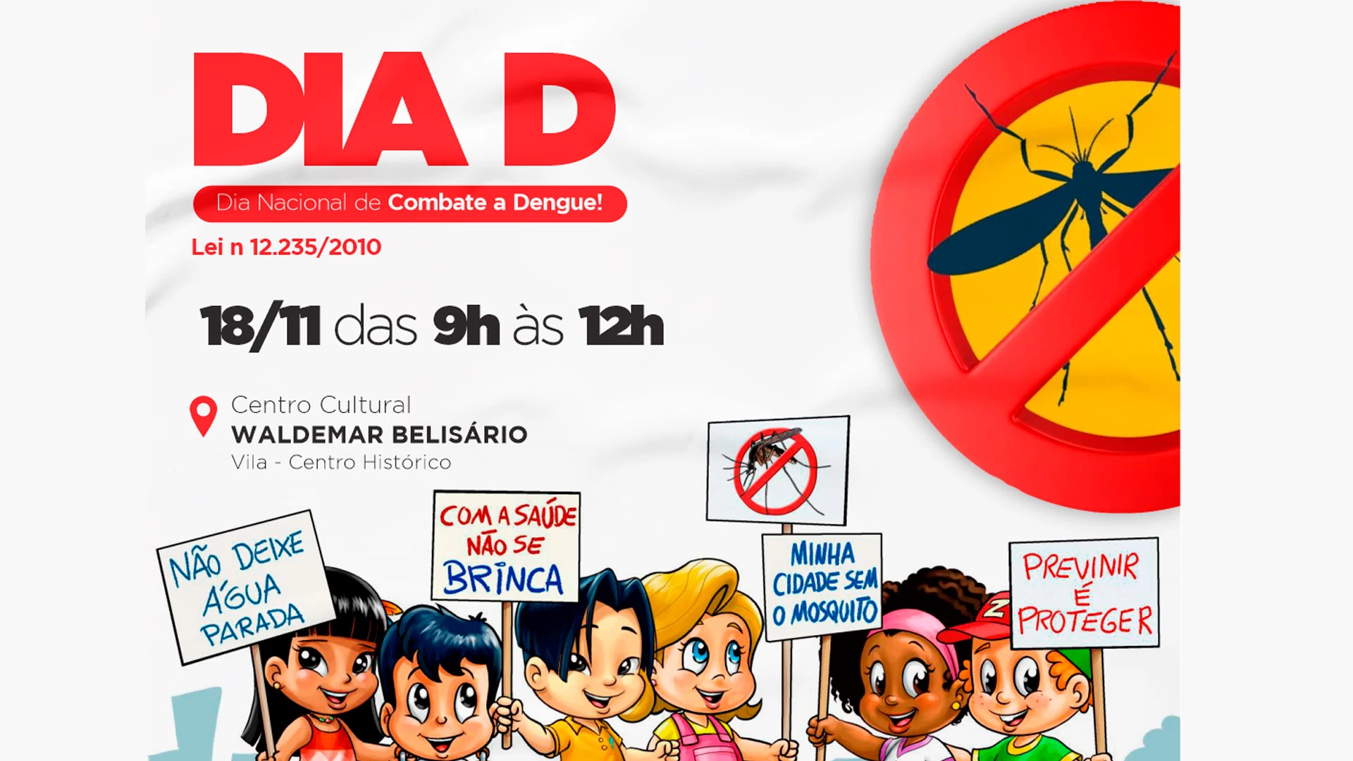 No próximo dia 18 de novembro de 2023, das 9h às 12h, será realizado o evento “Dia D (Dia Nacional de Combate à Dengue – Lei nº 12.235/2010)” no Centro Cultural Waldemar Belisário, na Vila. Com o objetivo de mobilizar a participação da população em ações de combate ao mosquito transmissor da dengue e outras arboviroses, o evento também marcará a conclusão do projeto de formação “Juntos contra a Dengue”, desenvolvido em parceria com a Secretaria de Educação.