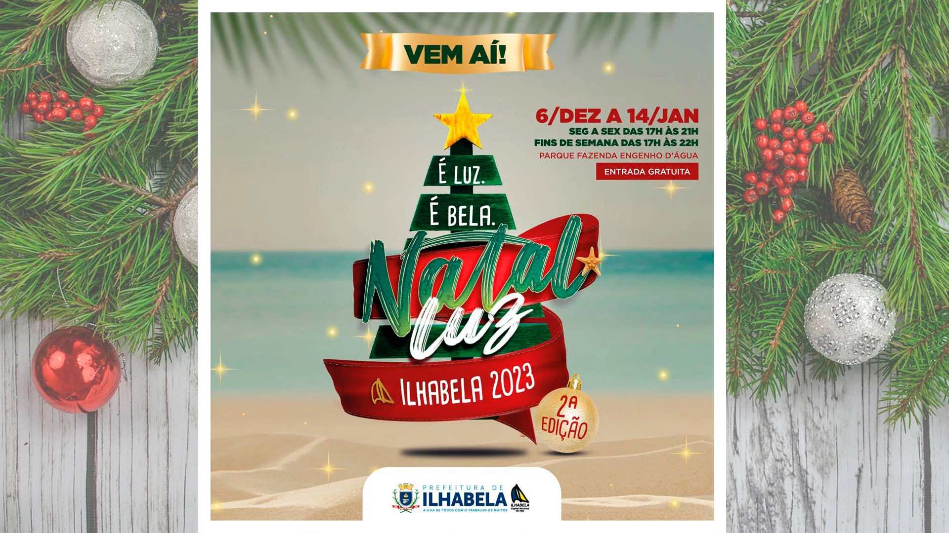 A Prefeitura de Ilhabela abre oficialmente a 2ª edição do Natal Luz nesta quarta-feira (6) às 18h30 no Parque Fazenda Engenho D’Água. Este ano, o evento conta com a parceria da Associação Comercial e Empresarial de Ilhabela (ACEI) e novas atrações.