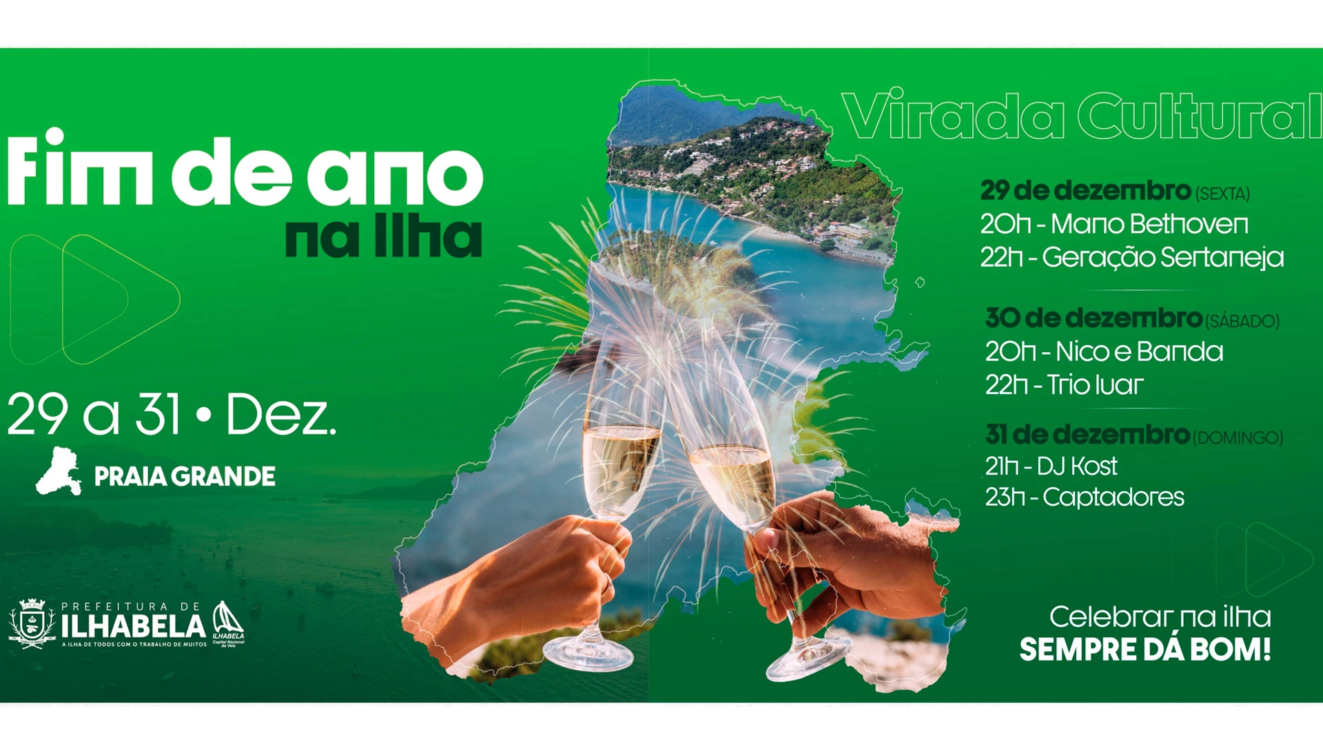 A última edição da Virada Cultural de 2023 será realizada na Praia Grande, região sul de Ilhabela de 29 a 31/12 com shows de músicos e bandas locais. O evento será realizado no Campo Society da Praia Grande, sempre a partir das 20h. São duas bandas por dia e no Réveillon (31), além dos dois shows, o local também recebe a queima de fogos sem estampido. Confira a programação completa: