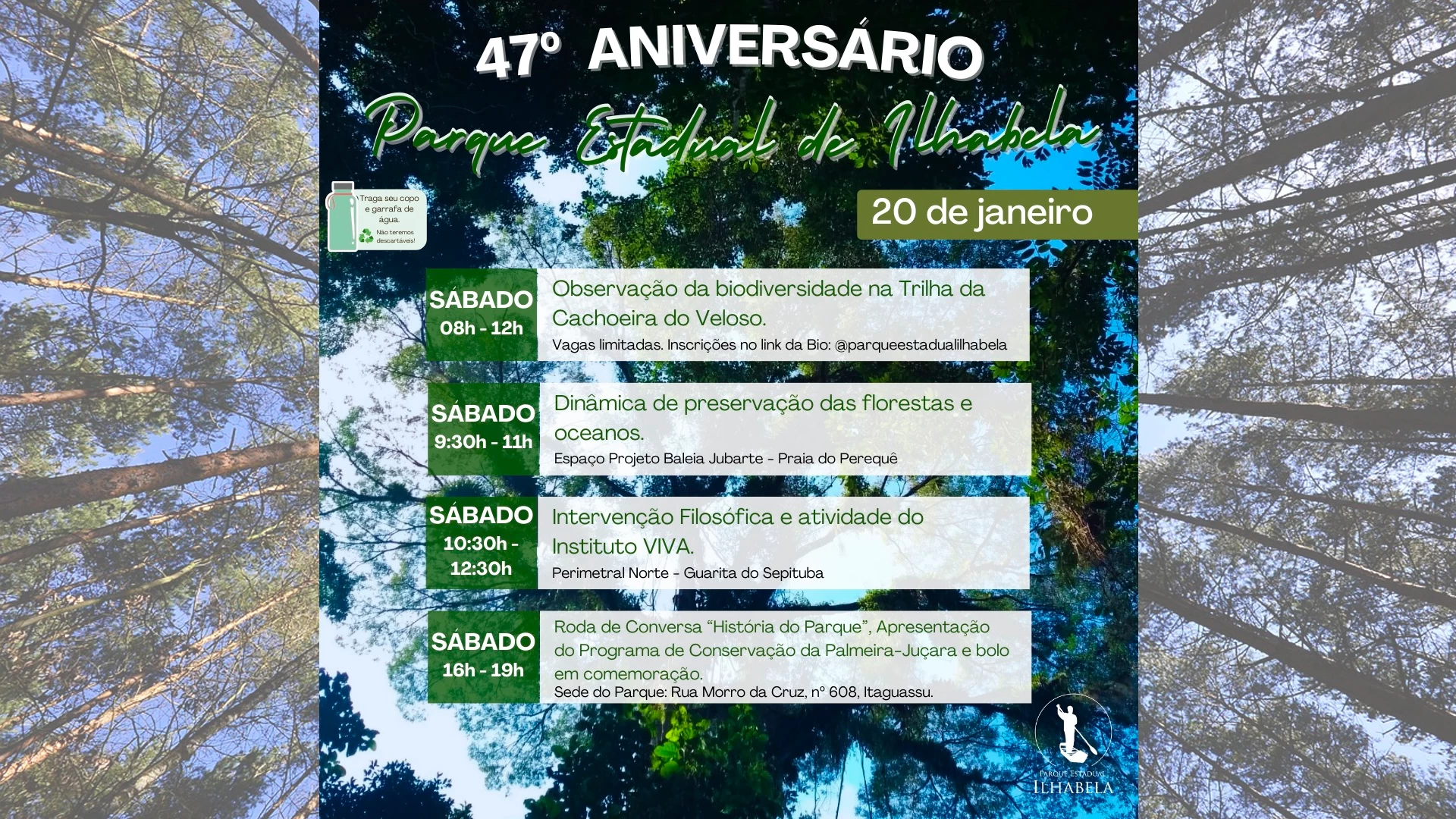 Em 20 de janeiro de 1977 foi criado o Parque Estadual de Ilhabela e em comemoração a esta data, teremos diversas atividades entre os dias 20 e 25 de janeiro!