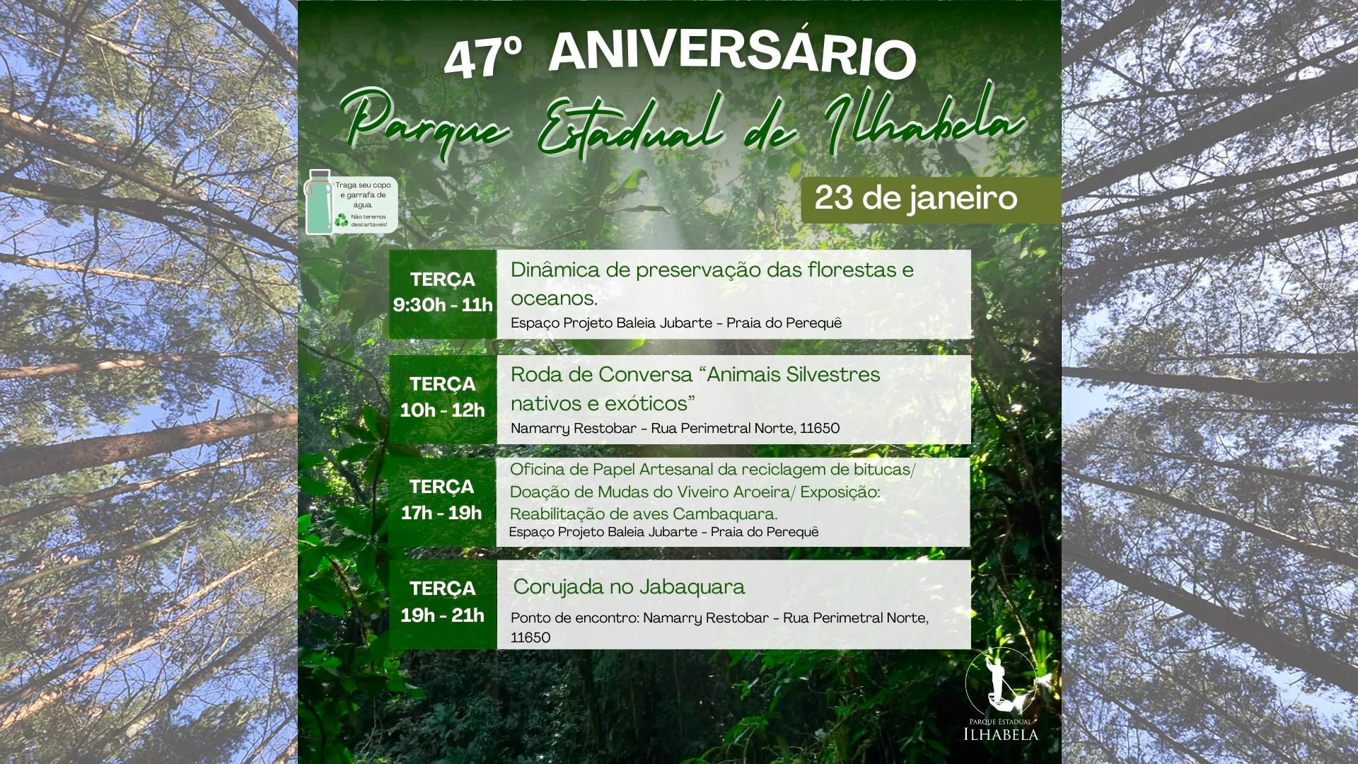Em 20 de janeiro de 1977 foi criado o Parque Estadual de Ilhabela e em comemoração a esta data, teremos diversas atividades entre os dias 20 e 25 de janeiro!