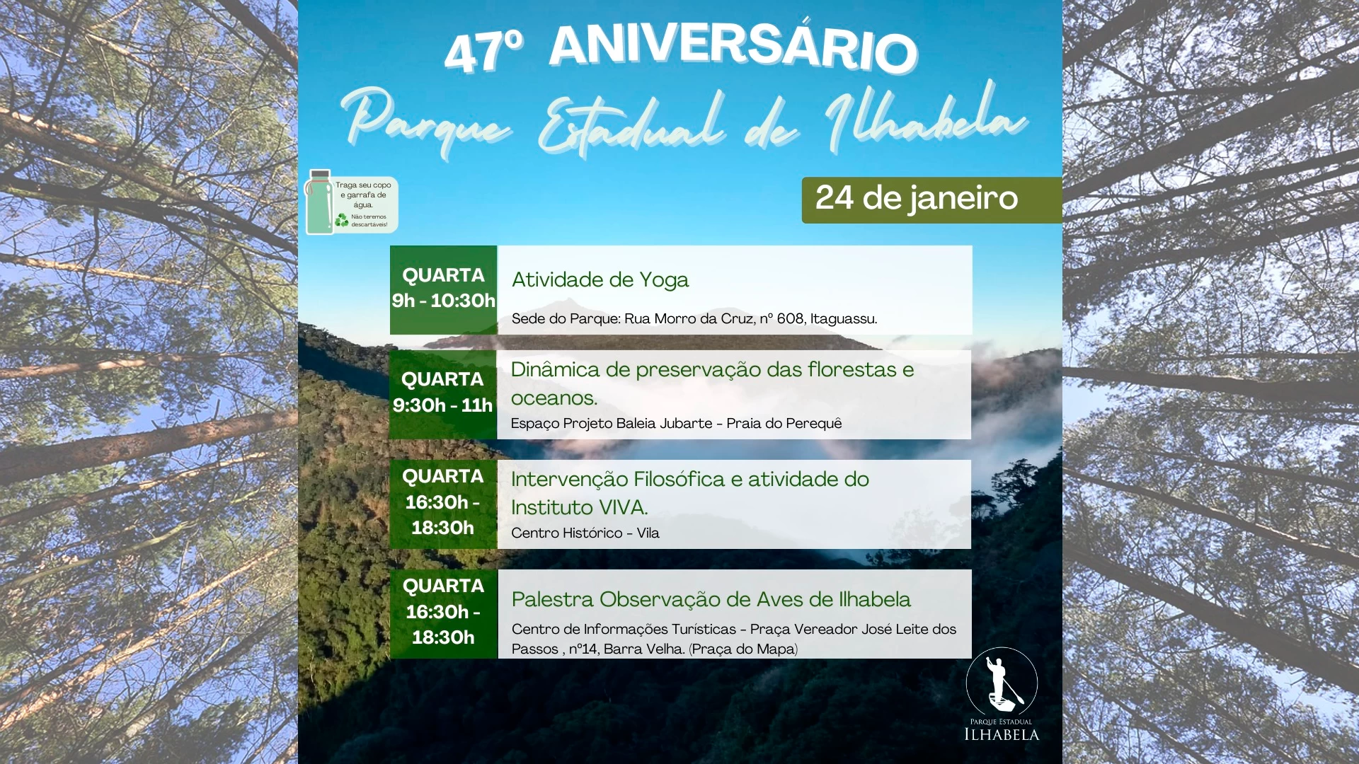 Em 20 de janeiro de 1977 foi criado o Parque Estadual de Ilhabela e em comemoração a esta data, teremos diversas atividades entre os dias 20 e 25 de janeiro!