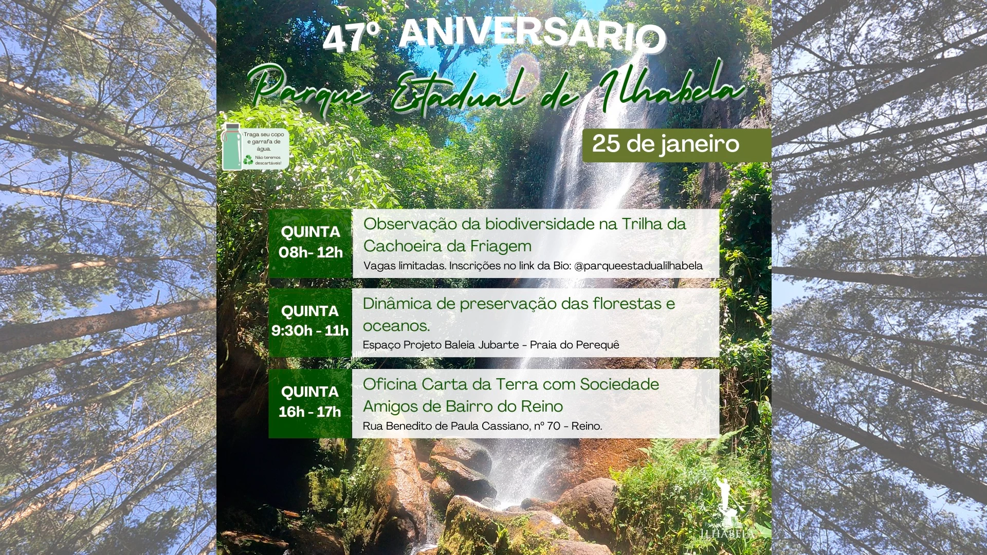 Em 20 de janeiro de 1977 foi criado o Parque Estadual de Ilhabela e em comemoração a esta data, teremos diversas atividades entre os dias 20 e 25 de janeiro!