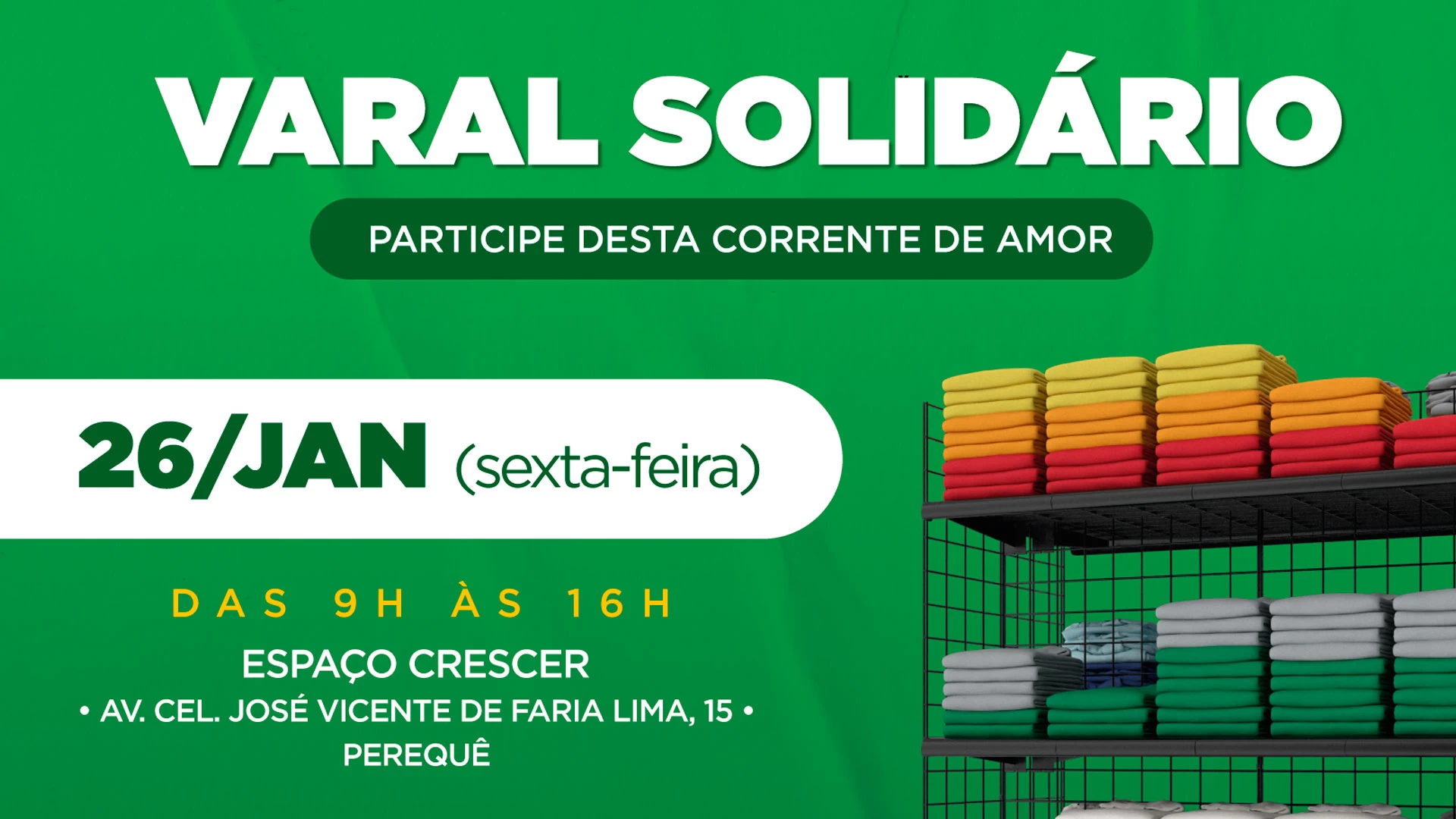 O Fundo Social de Solidariedade de Ilhabela promove, nesta sexta-feira (26), um Varal Solidário, das 9h às 16h, no Espaço Crescer, localizado na Av. Cel. José Vicente de Faria Lima, 15 – Perequê (antiga agência dos Correios). A ação é realizada em toda última sexta-feira do mês, com intuito de atender pessoas que necessitam de peças de vestimenta. As doações são destinadas apenas aos moradores de Ilhabela e não requer cadastro prévio.