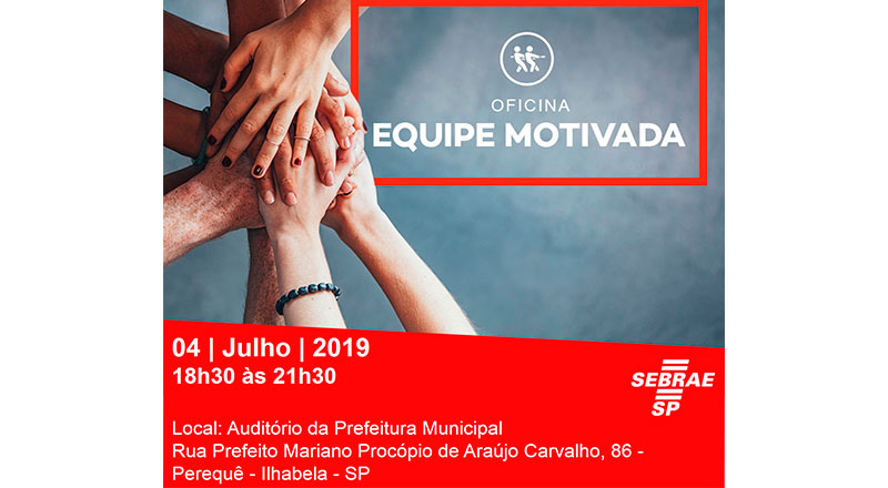 O Posto “Sebrae Aqui” de Ilhabela, por intermédio da Secretaria Municipal de Desenvolvimento Econômico e do Turismo, realiza, amanhã (4), a oficina “Equipe Motivada”, para quem deseja receber orientações sobre boas práticas para a gestão de pessoas. A oficina será a partir das 18h30, no auditório do Paço Municipal, no Perequê.