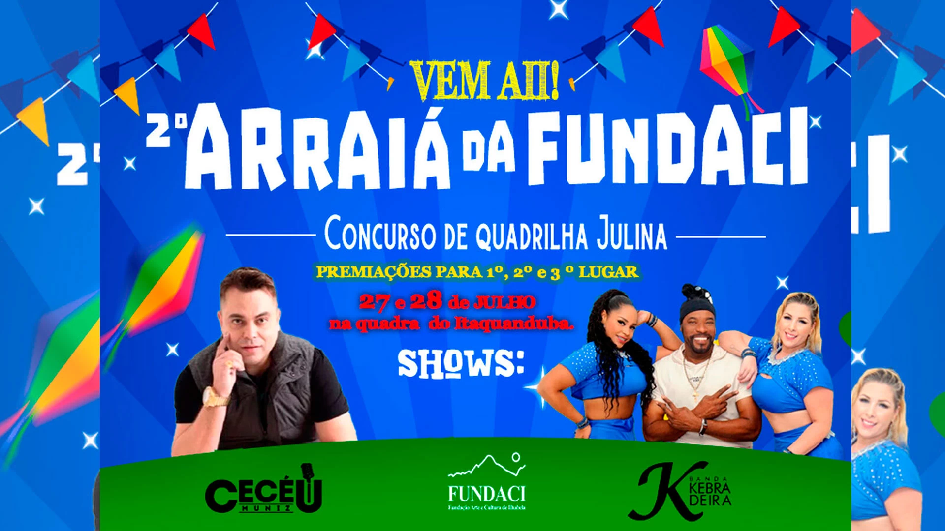 VEM AI O SEGUNDO ARRAIA DA FUNDACI, com barracas típicas, muita dança com o Concurso de quadrilhas Julina, e grandes shows: Cecéu Muniz e Banda e Banda KEBRADEIRA com os maiores sucessos da Bahia.