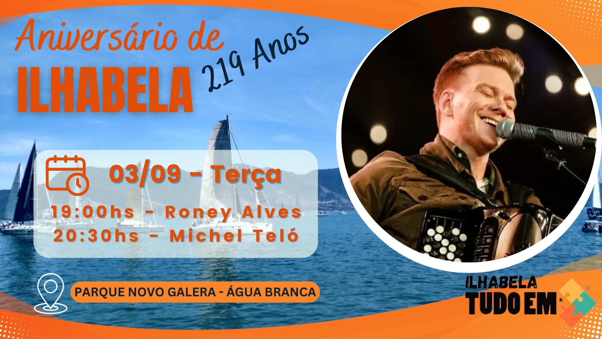No dia 3 de setembro, data oficial do aniversário de Ilhabela, quem chega para iniciar as comemorações é Roney Alves às 19h30 e às 20h30, o cantor e compositor de música sertaneja, Michel Teló comanda a festa, com os hits "Ai Se Eu Te Pego," "Fugidinha," e "Humilde Residência", que promete colocar todo mundo para dançar.