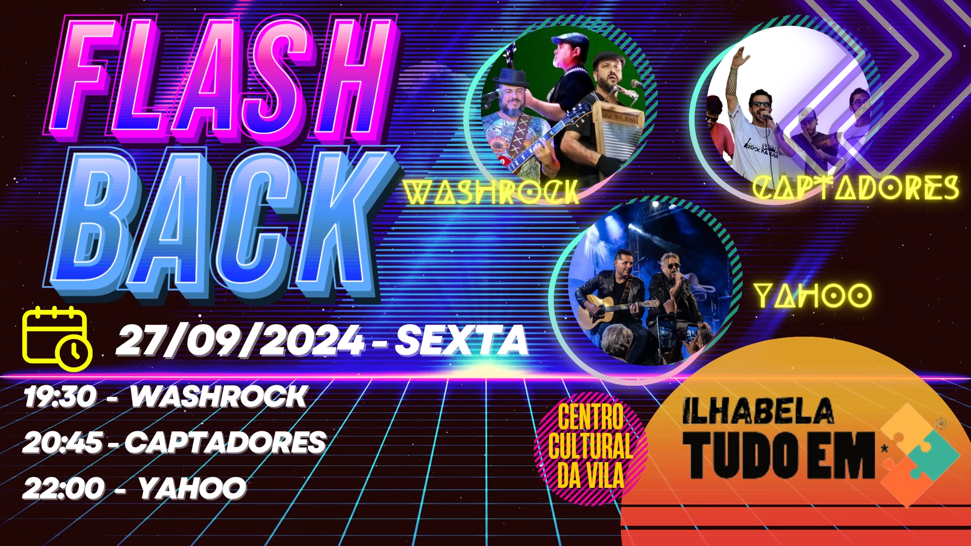 Com participação de músicos locais e artistas renomados do cenário nacional, o Festival Flashback promete três dias de muita nostalgia e diversão. Na sexta-feira, 27 de setembro, as apresentações começam às 19h30, com as bandas locais Wash Rock e Captadores, que animarão o público com grandes clássicos do rock. O destaque da noite fica por conta da banda Yahoo, que marcou os anos 80 e 90 com seu estilo romântico. Sucessos como "Mordida de Amor", "Pra Você Voltar", "Caminhos de Sol" e "Como o Vento" prometem embalar a noite e trazer boas lembranças aos espectadores.