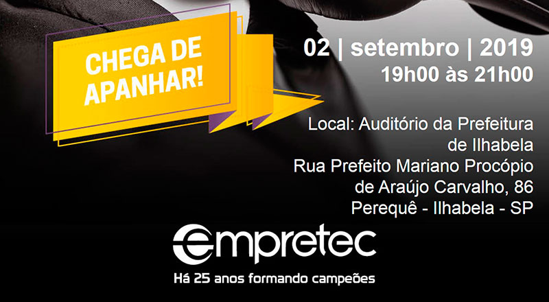 A Prefeitura Municipal, através da Secretaria de Desenvolvimento Econômico e Turismo, em parceria com o Sebrae SP, Associação Comercial e o Convention & Visitors Bureau de Ilhabela, realizam a palestra “Empretec”. O evento acontecerá no dia 2 de setembro, às 19h, no auditório do Paço Municipal. A Prefeitura de Ilhabela e o Sebrae/SP destinaram 30 vagas para os empresários do município
