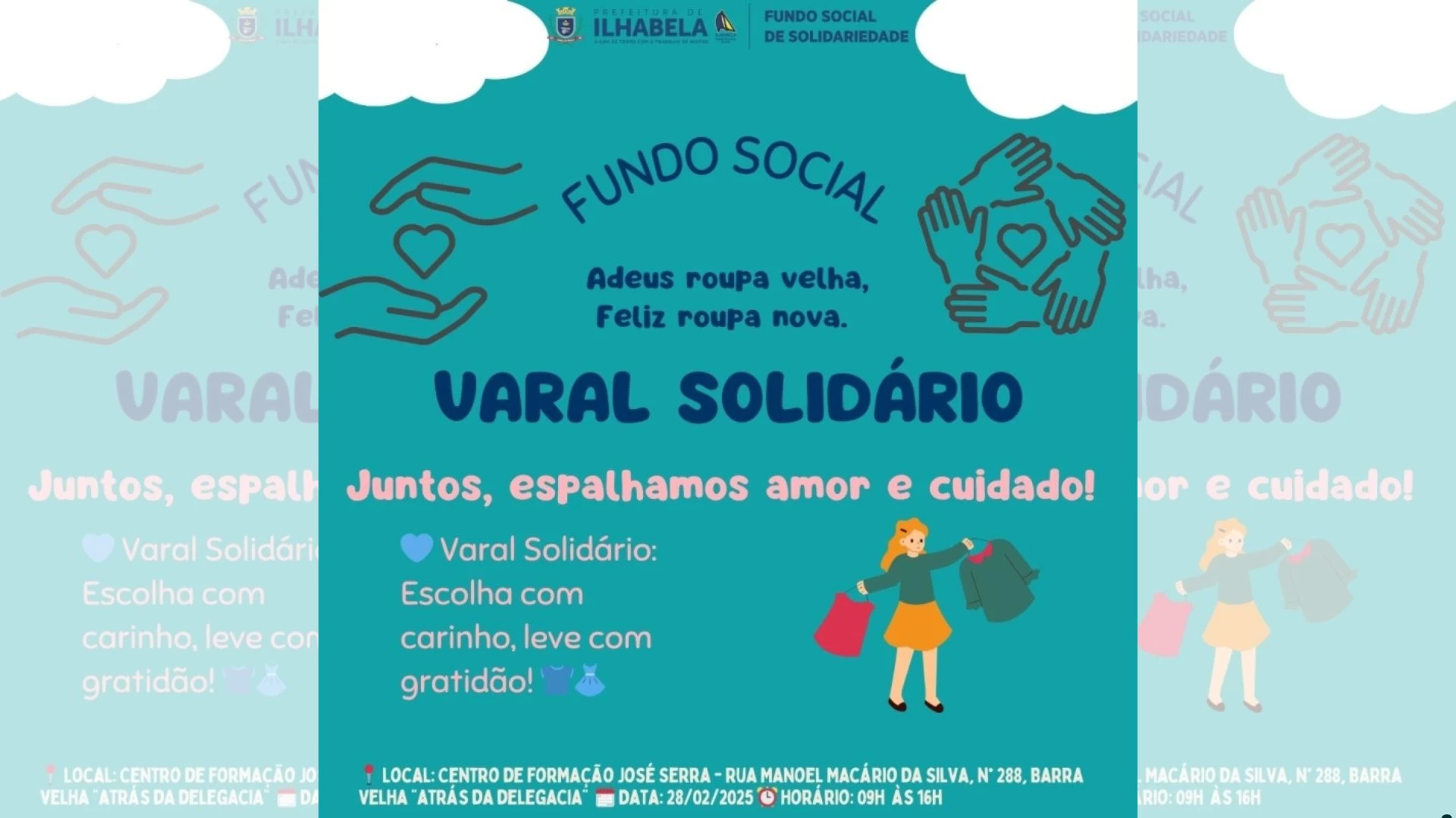 A Prefeitura de Ilhabela, por meio do Fundo Social de Solidariedade, realiza o Varal Solidário intitulado “Adeus roupa velha, feliz roupa nova” nesta sexta-feira (28). A ação ocorre das 9h às 16h, no Centro de Formação Profissional, localizado na Rua Manoel Macário da Silva, nº 288, Barra Velha.