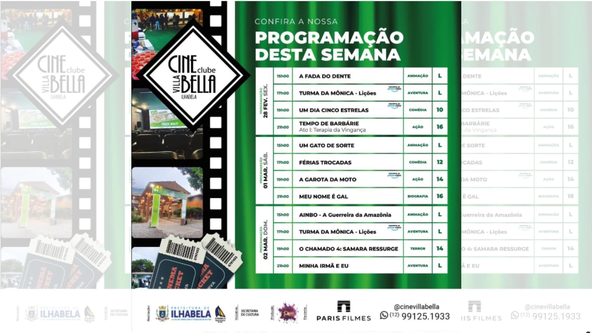 O Cine Villa Bella & Clube de Ilhabela divulgou sua programação especial para o final de semana, trazendo uma seleção variada de filmes que prometem entreter públicos de todas as idades. As sessões acontecerão entre os dias 28 de fevereiro e 2 de março, com exibições a partir das 15h e encerramento às 21h.