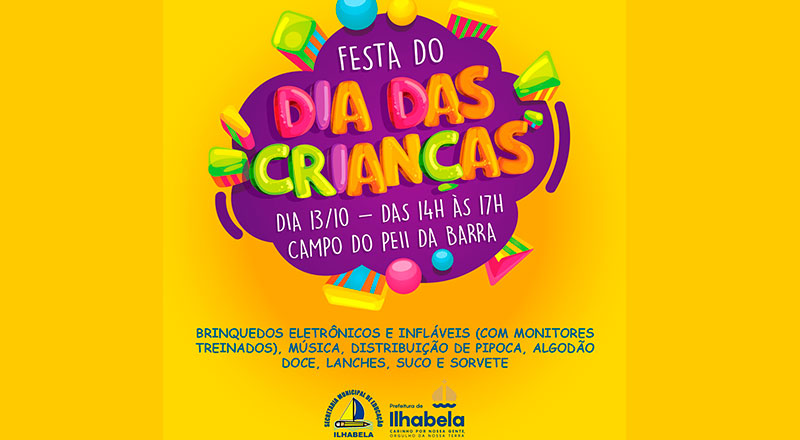 A Prefeitura de Ilhabela, por meio da Secretaria de Educação, divulga a Festa em comemoração ao Dia das Crianças, que acontecerá domingo dia 13, a partir das 14h no Campo do PEII da Barra Velha.