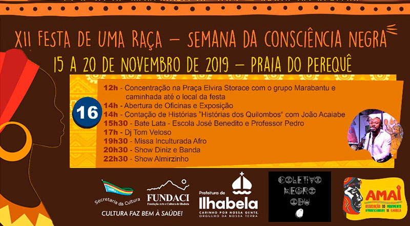 O Dia da Consciência Negra é comemorado em 20 de novembro em todo o país. A data homenageia o Zumbi dos Palmares, um escravo conhecido como líder do Quilombo dos Palmares. Em alusão à data, a Prefeitura de Ilhabela, por meio da Secretaria de Cultura, traz uma programação cultural especial em comemoração à data, para moradores e turistas, entre os dias 15 e 20 deste mês, na Praia do Perequê.