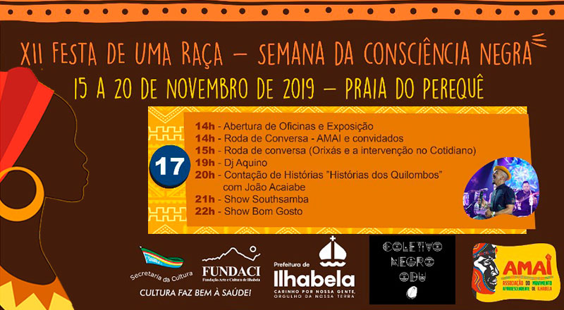 O Dia da Consciência Negra é comemorado em 20 de novembro em todo o país. A data homenageia o Zumbi dos Palmares, um escravo conhecido como líder do Quilombo dos Palmares. Em alusão à data, a Prefeitura de Ilhabela, por meio da Secretaria de Cultura, traz uma programação cultural especial em comemoração à data, para moradores e turistas, entre os dias 15 e 20 deste mês, na Praia do Perequê.