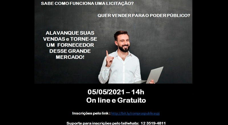 O evento será online e gratuito, e o interessado poderá realizar a inscrição pelo link: http://bit.ly/compraspublicaspj, caso o mesmo precise de alguma assistência, deverá entrar em contato pelo telefone: 1299168-2875 (WhatsApp).
