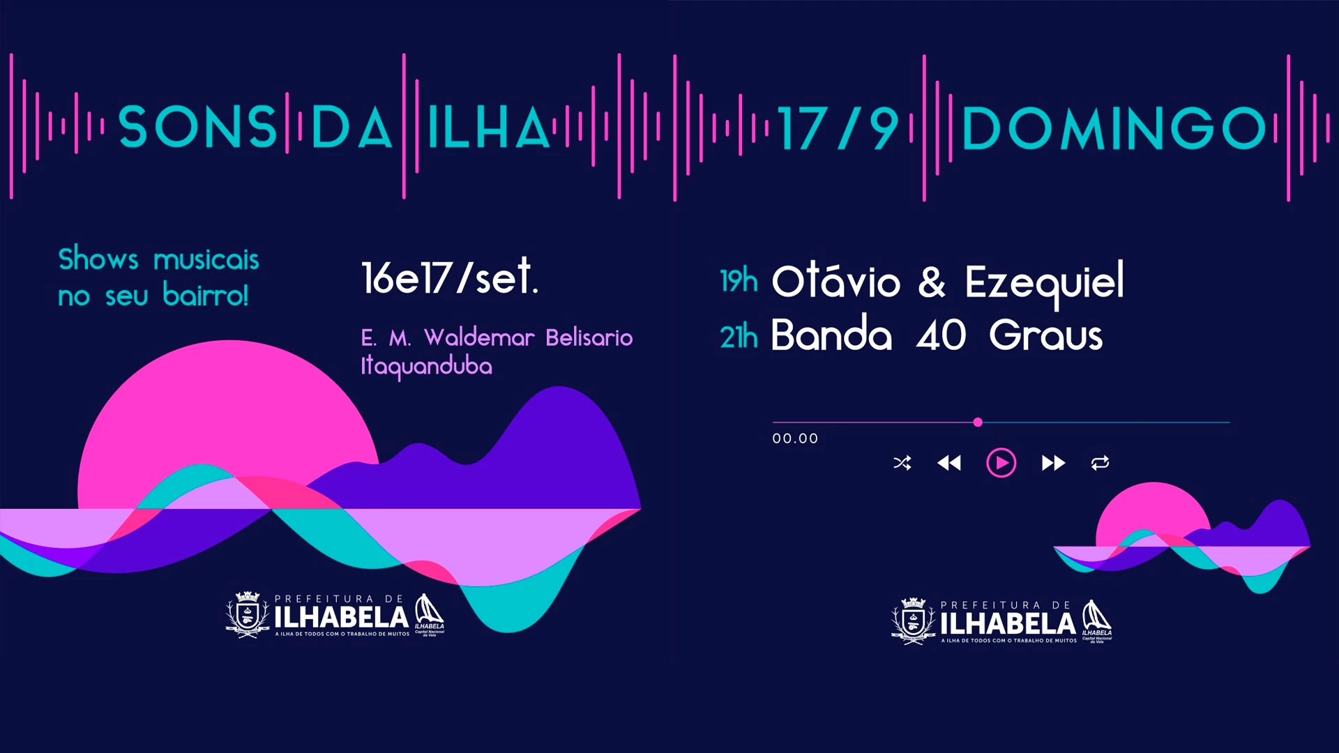 A Prefeitura de Ilhabela promove neste fim de semana (16 e 17/9) a partir das 19h o projeto "Sons da Ilha", com apresentações musicais na Escola Municipal Waldemar Belisário. O objetivo é levar cultura para os bairros e valorizar os músicos locais.