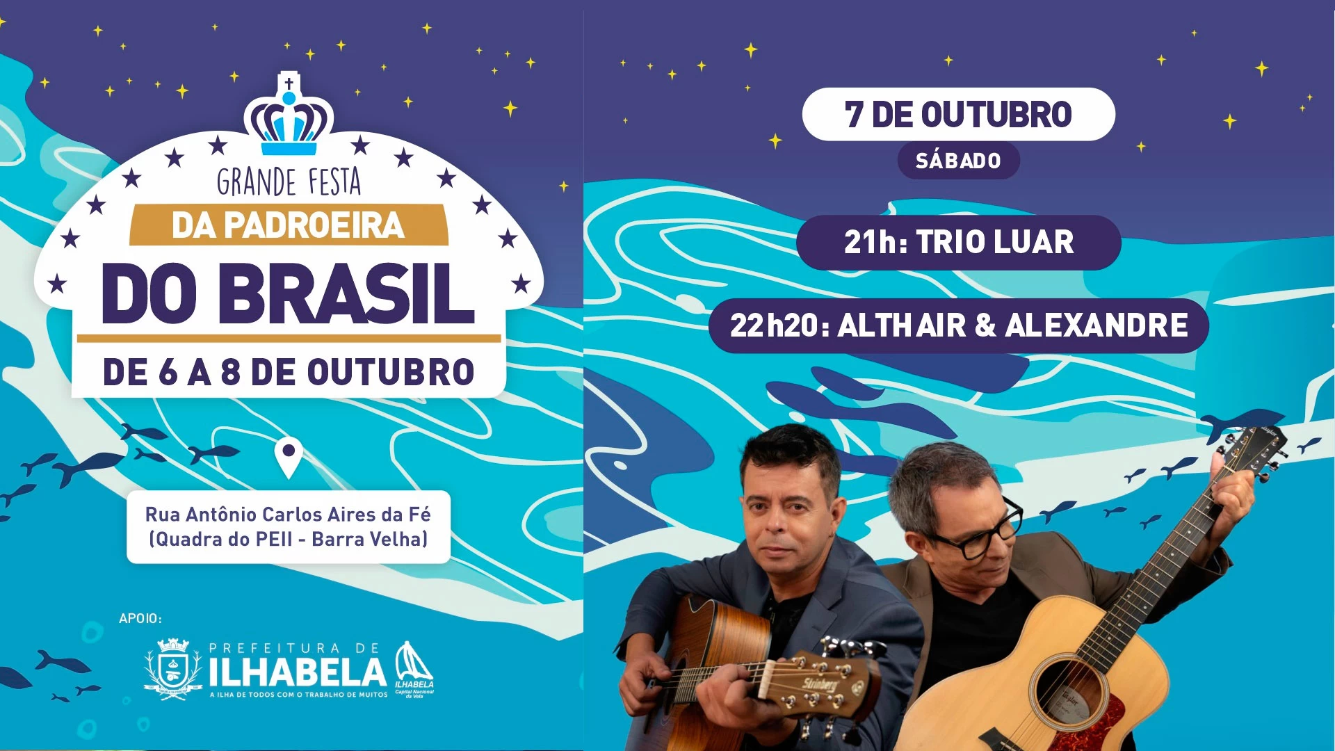 No sábado (7/10), às 21h, é a vez do grupo de forró local “Trio Luar” abrir a noite de apresentações, seguido da dupla sertaneja Althair & Alexandre, às 22h.